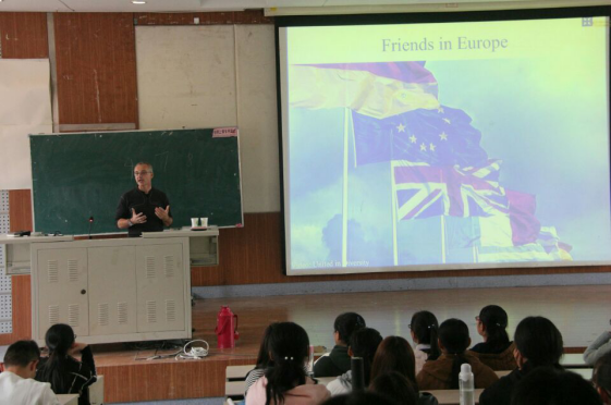 Petrik首先系统地介绍了欧洲的国家及分布情况,将欧洲各国与中国进行比较,向学生详细讲解了欧盟及其成员国家,同时通过分享相关视频及图片的方式,让学生更加直观地了解欧洲,加深学生印象。随后,Petrik通过图片展示了自己的家乡——英国,并和学生们分享了自己的家庭和生活情况。最后,学生积极向Petrik提出疑问,Petrik逐一热心解答,最终表达了对学生们的美好祝愿。