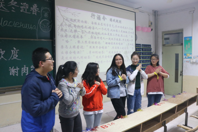 活动以“送冬迎春·欢度谢肉节”为主题,以俄罗斯谢肉节“迎春日”、“始欢日”、“宴请日”、“狂欢日”、“岳母晚会日”、“小姑子聚会日”和“送别日”的七日为主线,共分七个环节。活动在温暖的“迎春日”中拉开序幕,俄协成员们分发佩戴象征“太阳”的薄饼和黄丝带,让大家感受到春日般的温度;在“岳母晚会日”中,“谁是卧底”环节展现出参与者清晰的表达能力与敏捷的反应能力。最后,“送别日”中俄语系外教亚历山大·尼古拉耶维奇讲述俄罗斯节日习俗,进一步加深了学生对俄罗斯文化的了解。