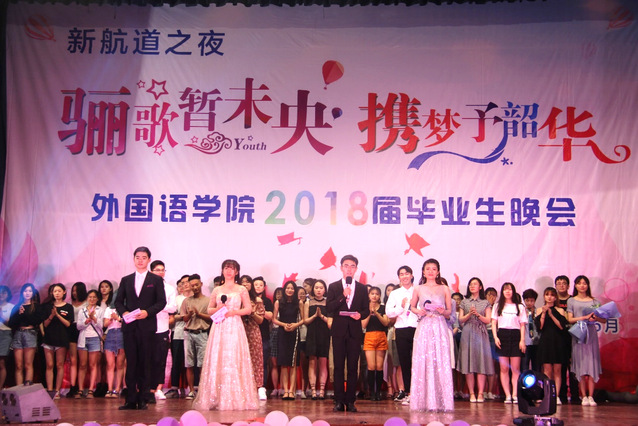 6月14日,外国语学院于北校区西礼堂举办“骊歌暂未央,携梦予韶华”主题毕业晚会,欢送2018届毕业生。学院领导、各系各专业主任、部分教师和全体辅导员出席晚会现场,为毕业生送别。