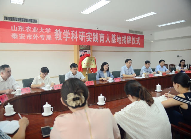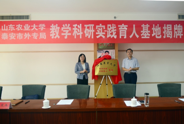 7月9日,山东农业大学教学科研实践育人基地落户泰安市外国专家局。副校长张然出席签约仪式,与市委组织部副部长、泰安市人社局党委书记、局长蒋永斌共同为基地揭牌。