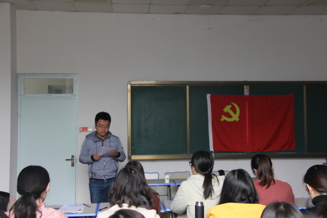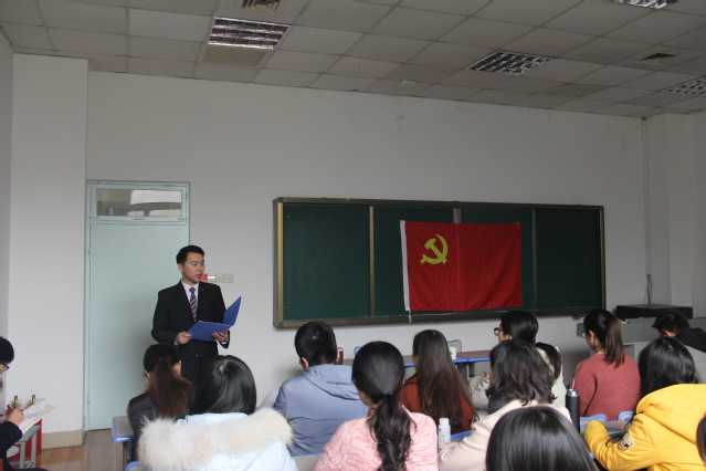 最后,学院党委副书记孙慧敏对所有党员提出明确要求。她说,加入中国共产党是人生政治生活的一个新起点,也是今后学习、工作、生活的一个新开端。希望全体党员不忘初心,牢记党员使命,向优秀党员看齐,严格要求自己,关注时政,加强党的基本理论知识学习,提高政治理论水平,继续端正入党动机,增强党性,自觉把思想统一到习近平总书记系列重要讲话精神上来,转化为做学风建设、安全稳定、考研就业和创新创业先锋楷模的实际行动,踏踏实实的为青年学生服务,为实现中华民族伟大复兴和学院学校发展贡献自己的力量。