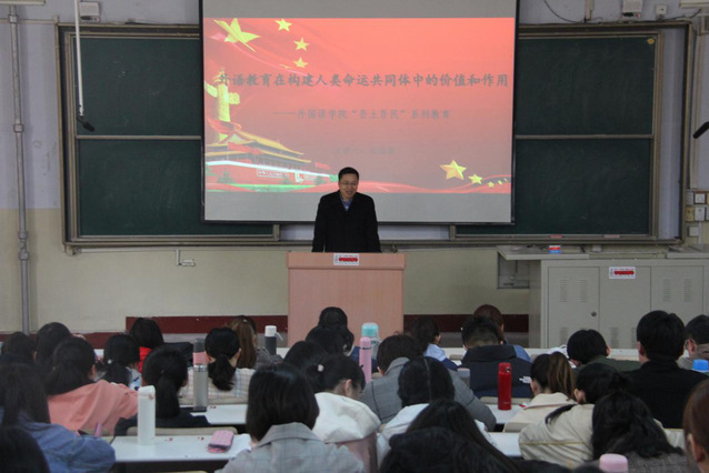 近日,外语学院于北校区教室5S106举办“吾土吾民”形势与政策专题报告会。学院教授石运章担任主讲人,为2017级学生作“外语在推动人类命运共同体进程中的作用与价值”主题报告。