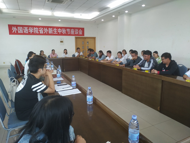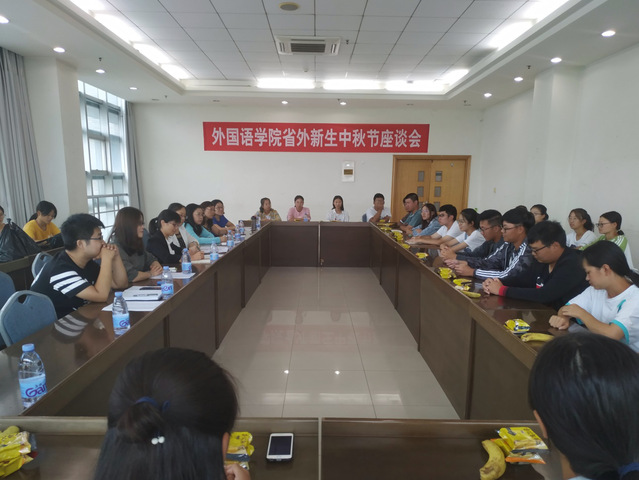 9月12日,外语学院于南校区图信楼402举办省外新生中秋节座谈会。学院学生工作负责人、各系主任、辅导员和部分省外新生代表参加座谈会。