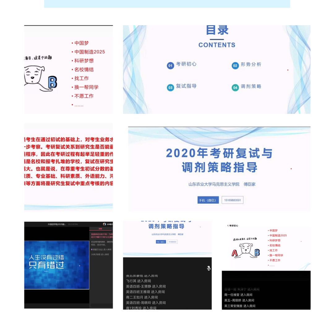 5月12日,学院院长翟红华从形势分析、复试指导、调剂指导3个方面展开指导。她首先以今年学院考研专业、人数,各校分数线及录取名额的数据为切入点,帮助学生认清形势、合理定位,以便有针对性地投入复试准备。随后,她以外语专业为例,对复试流程做详细分析。她说,从自我介绍到朗读、翻译和回答问题,复试的每项考察都是对考生专业能力和综合素质的检验,初试排名高的同学也不能松懈,以免被逆袭淘汰。关于调剂,她建议考生根据个人实际情况适当选择调剂学校,鼓励学子们不要气馁,只要不放弃一切皆有可能。最后,学院党委副书记孙慧敏,专业主任赵燕、张帅臣和潘洁老师就复试中可能遇到的时政热点问题、仪表仪态、复试流程和以往辅导经验做了补充介绍。