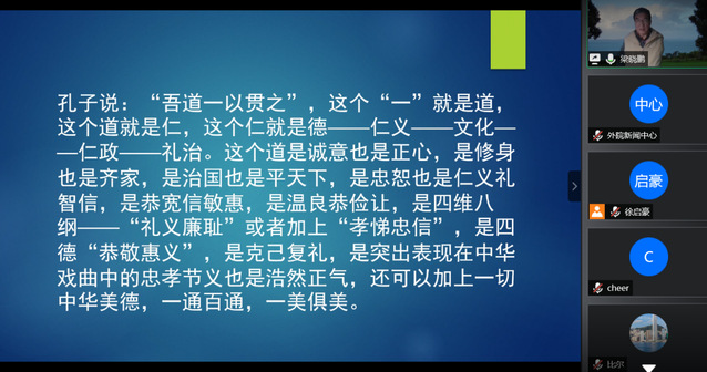 梁晓鹏教授以“乐鱼网页版外译与中华文化走出去”为题展开阐述。他认为,乐鱼网页版翻译并非是一蹴而就的,翻译需要长期积累沉淀,并详实论述了翻译行业需要关注的多个领域。接着,他详细讲解了目前翻译项目申报所面临的形势、存在的问题和相应解决方法,鼓励大家要积极参与出版社的项目,要仔细研究国家社科出版社内容等。最后,他以儒学孔子的古文为例,进行翻译示范并从翻译技术层面和策略层面为大家提出意见和建议。互动环节中,梁晓鹏就师生们提出的翻译问题和申报问题逐一进行解答,并给予具体指导。