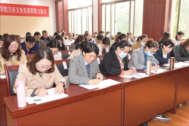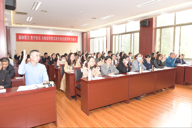 会上,学院党委书记李茂兵代表学院党委向大会作报告。报告回顾总结过去五年工作,规划今后五年的发展目标和重要任务,明确将在教学实践、课程思政、大学外语教学改革、硕士点申报、师资建设、人才培养、校企合作、国际交流等方面下大气力加强改进,采取有力措施促进提升,继续加强意识形态工作、学院班子和中层干部队伍建设以及党支部和党员队伍建设,认真贯彻落实党风廉政建设责任制,凝聚民心形成学院发展合力,以强有力的党建和思想政治工作,为各项目标任务落实提供坚强保障,推动学院又好又快发展。