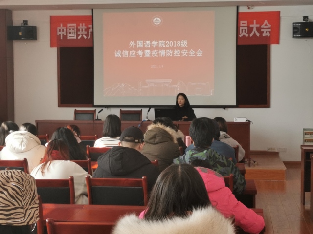 1月8日,外语学院分年级举办考前诚信暨寒假安全教育大会,全体辅导员和全体学生参加会议。