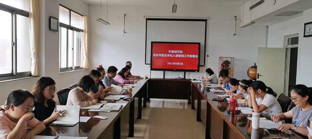 9月3日,外语学院在文理大楼321召开课堂考勤及手机入袋管理工作部署会,学院班子成员、系室主任副主任及专业主任、全体辅导员参加会议。