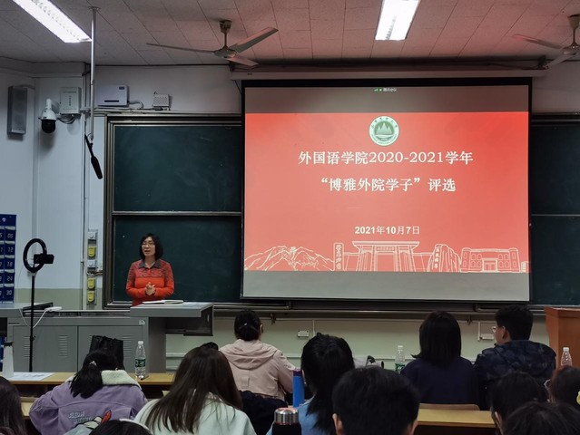 10月7日,外语学院在岱宗校区5N201举办首届“博雅外院学子”评选大会,学院学生工作负责人,全体辅导员,2018、2019、2020级部分学生于线下、2021级全体学生于泮河校区线上参加活动。