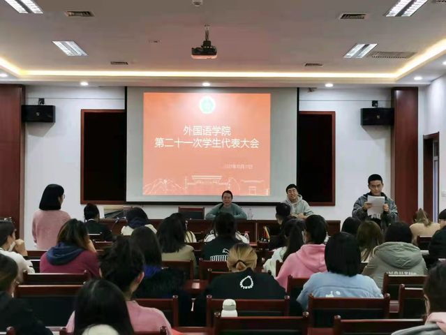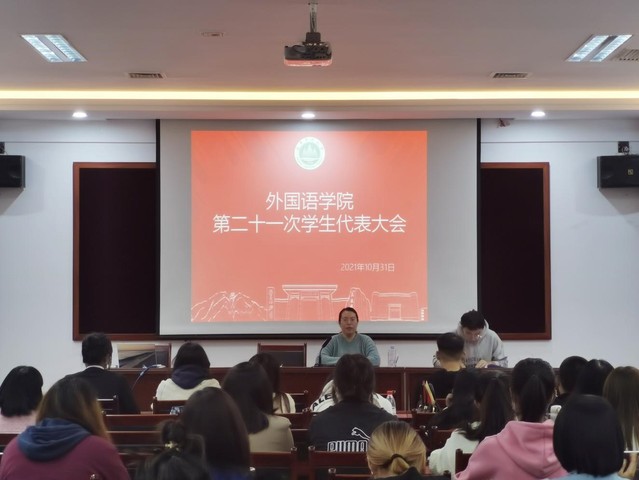 10月31日,外语学院在文理大楼211举办第二十一次学生代表大会,学院团委书记吕夏毅、各年级学生代表参加会议。