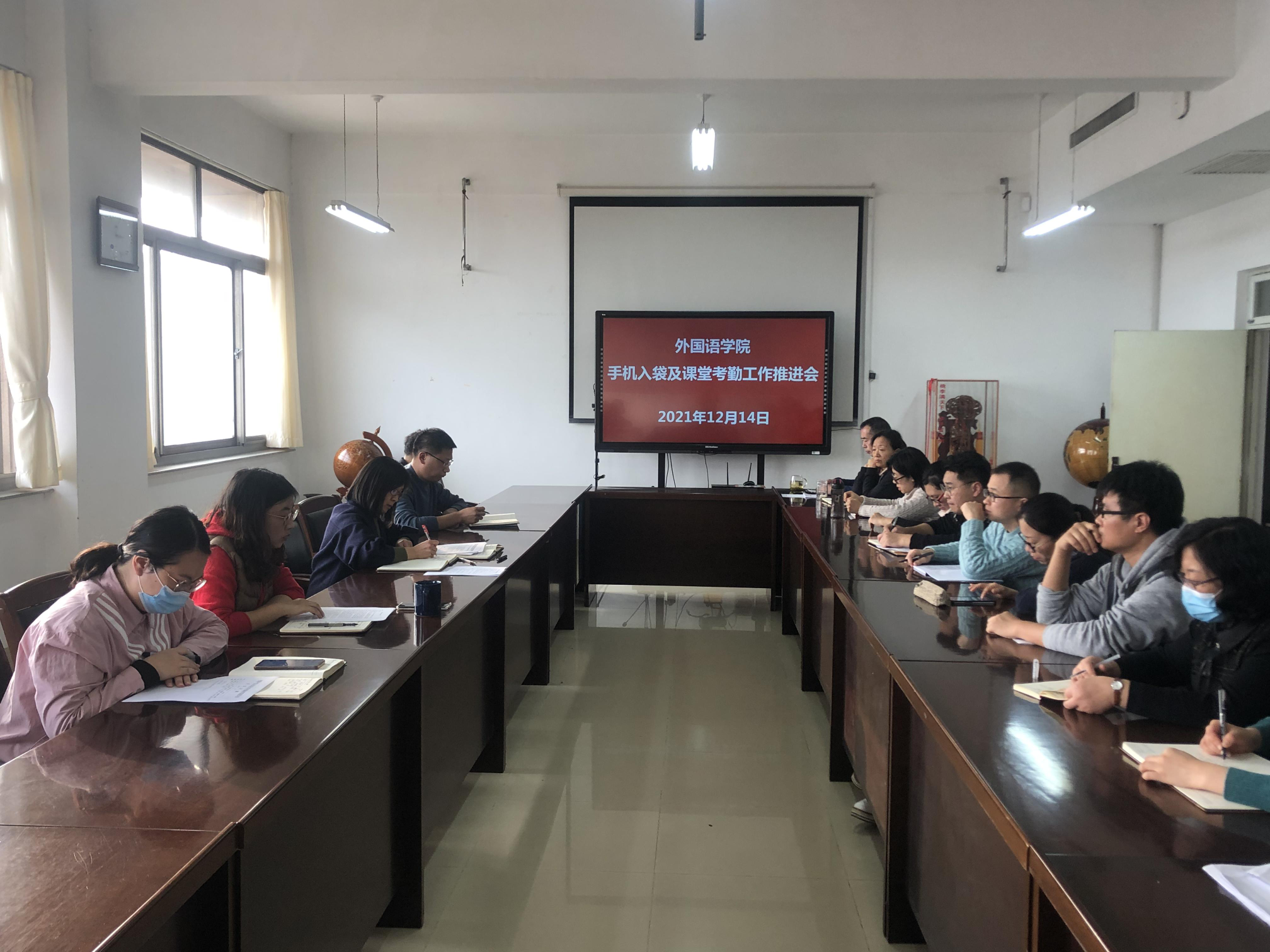 12月14日,外语学院在文理大楼321召开手机入袋及课堂考勤工作推进会,党委委员,系主任、副主任,专业主任及全体辅导员参加会议。