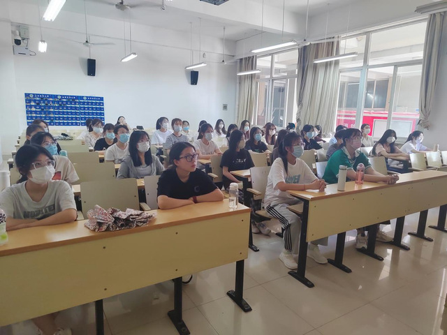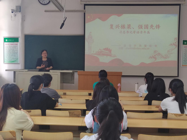 6月1日,外语学院院长翟红华教授在泮河校区S115为青年学子上了一堂以“复兴栋梁、强国先锋”为主题的思政课,2021级商务英语1班全体学生、部分电商专业学生以及辅导员参加活动。