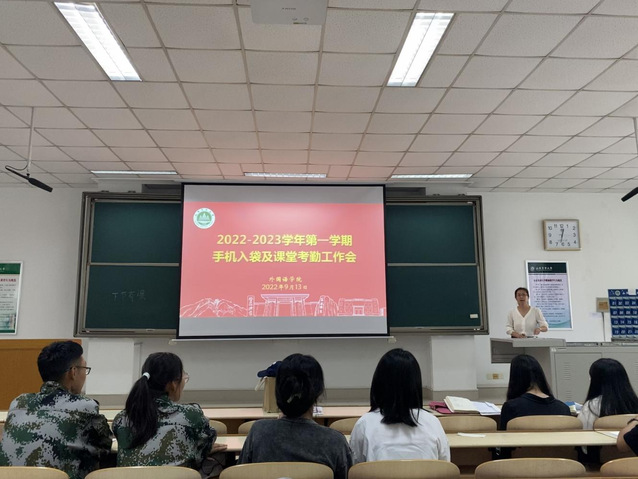 9月13日,外语学院在泮河校区N103召开手机入袋及课堂考勤工作会,学院学生工作负责人、全体辅导员、学生干部和学生党员参加会议。
