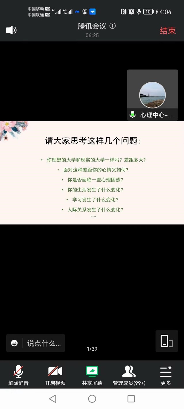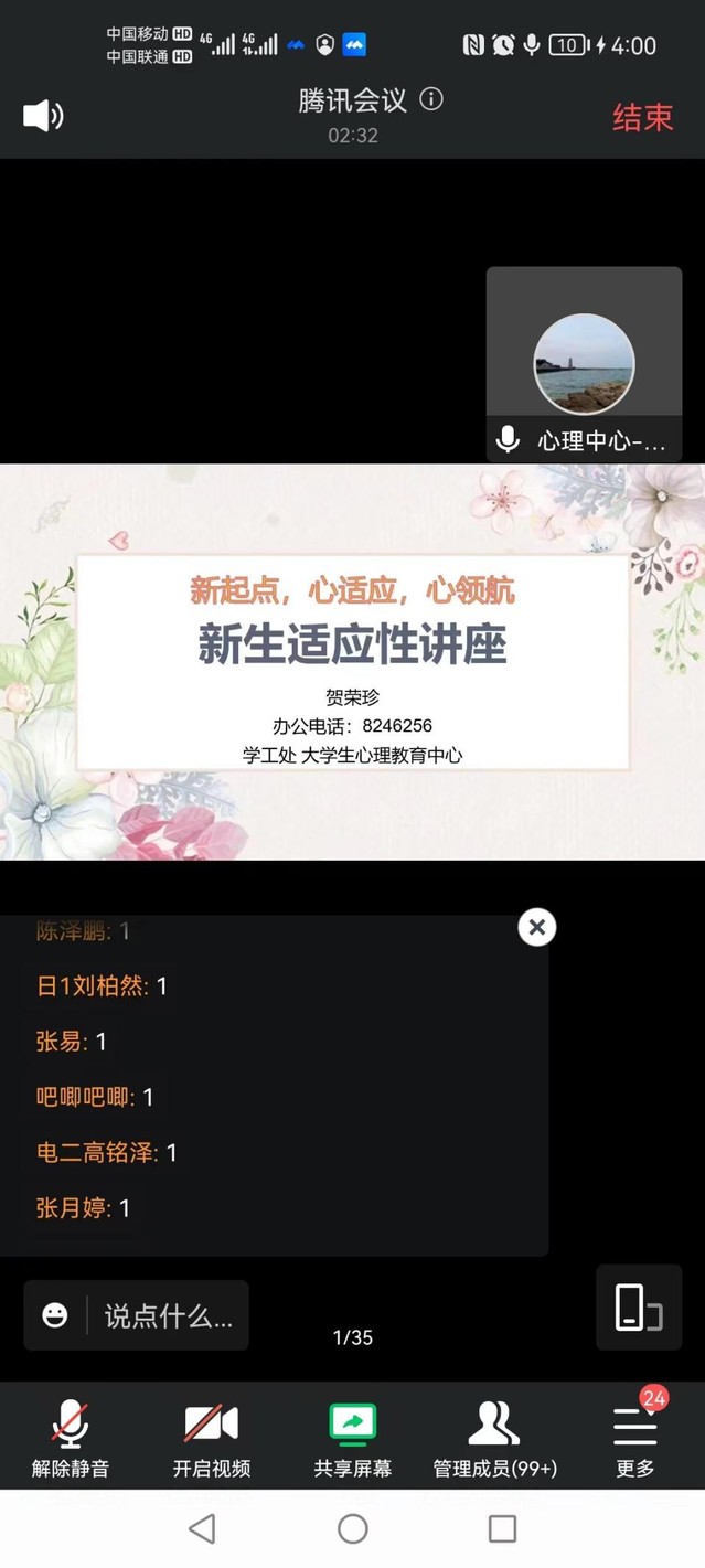 10月13日,外语学院通过腾讯会议线上举办“新起点,心适应,心领航”主题新生适应性讲座,邀请大学生心理教育中心贺荣珍老师为大家作报告,2022级全体新生参加活动。