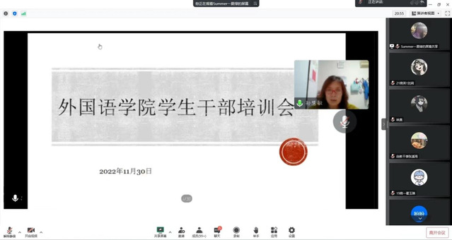 11月30日,外语学院通过腾讯会议召开学生干部安全稳定工作会议。学院学生工作负责人,全体辅导员,全体学生干部和全体学生党员参加会议。