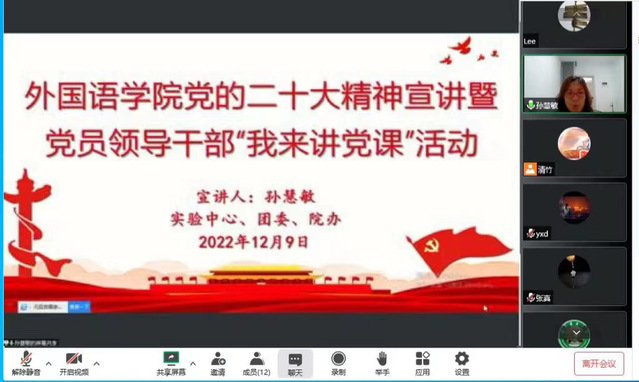 12月8日至11日,外语学院党委组织班子成员深入各系室、党支部开展党的二十大精神宣讲暨党员领导干部“我来讲党课”活动。