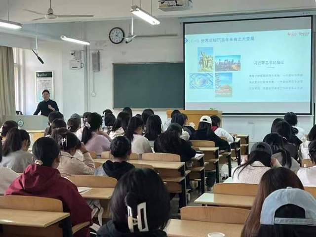 10月7日,外语学院党委书记胡化坤在泮河校区综合楼S219,面向新生作“当前的国际形势与我国周边安全形势”专题形势与政策讲座,2023级商务英语专业学生及辅导员参加活动。