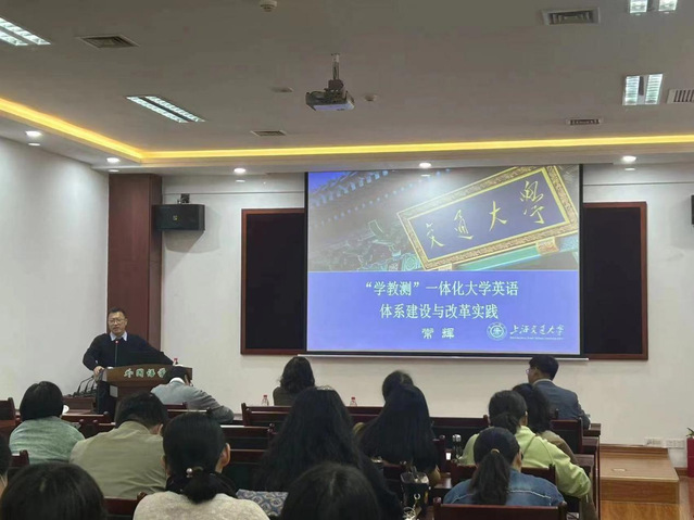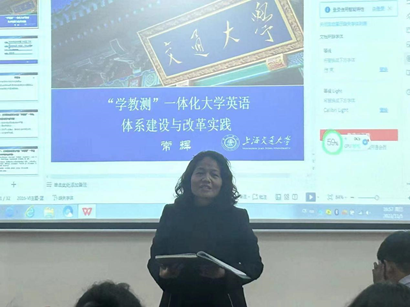 报告会上,常教授首先简要回顾我国大学英语改革的历程,指出大学英语教学改革战略意义,以及面临的主要问题,认为数据监测及其充分利用对大学英语教学改革意义重大。然后,阐述大学英语改革必须进行系统设计和体系构建,讲述了“学教测”一体化的核心理念及其改革实践。认为大学英语改革要取得成功,必须构建“学、教、测”三位一体的系统,做好顶层设计,构建教学理念体系、课程体系、教学体系、教学支撑体系、评价体系和监督体系,并做好实践和研究工作。最后,介绍上海交通大学在大学英语体系构建与改革探索方面所做的工作,并指出“学教测”一体化的未来走向。