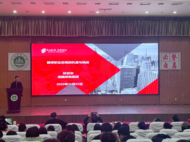 林世宋以“翻译职业发展的机遇与挑战”为主题,利用中国大型翻译公司领域分布数据,详细向同学们介绍企业发展情况。通过“人工翻译会被机器翻译所替代吗”话题,深度复盘当下翻译型企业的“机遇”与“挑战”,引导同学们深刻把握中国发展走向,认清世界发展趋势,踔厉奋发守初心,笃行不怠担使命。最后,林世宋强调青年学子要勤于学习、善于学习、敢于学习,不仅要夯实语言基础,也要丰富自己的实践经验。深入探索未来破局之法,为青年引路。
