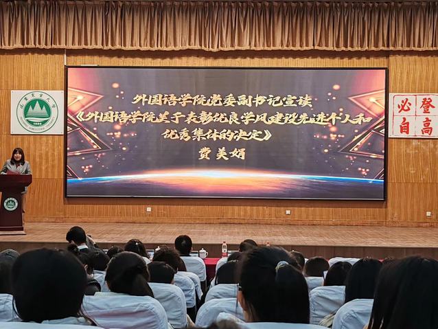 党委副书记费美娟宣读表彰先进个人和优秀集体决定,她指出外语学院始终秉承“博雅外院”的院训精神,坚持培养“外语+”复合型高质量人才,希望受表彰的个人和集体,发扬模范精神,奋发有为,拼搏进取。副院长李桂东宣读《乐鱼(中国)官方优秀大学生培养计划实施意见》,旨在促进学院学风建设,实现三全育人实效,培养专业优秀学生,形成浓厚学习氛围。