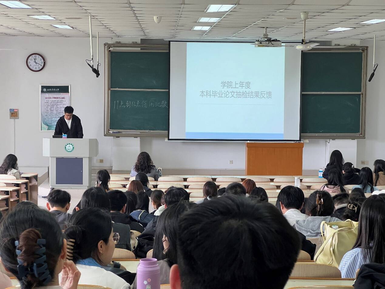 会上,李桂东传达了学校2024届本科毕业论文的要求,反馈了上年度专家对本科毕业论文抽检的结果,并从格式规范、摘要和文献综述、分析论证和语言表达四个方面针对性地指出毕业生在撰写论文时所要规避的错误。最后,他要求毕业生端正态度,严格按学校论文格式要求编辑,反复修改,在答辩中展现良好的状态,严格恪守乐鱼网页版规范,杜绝乐鱼网页版不端行为。